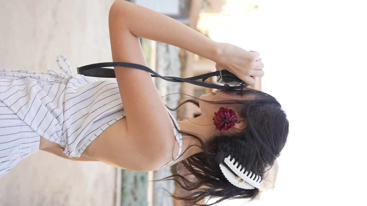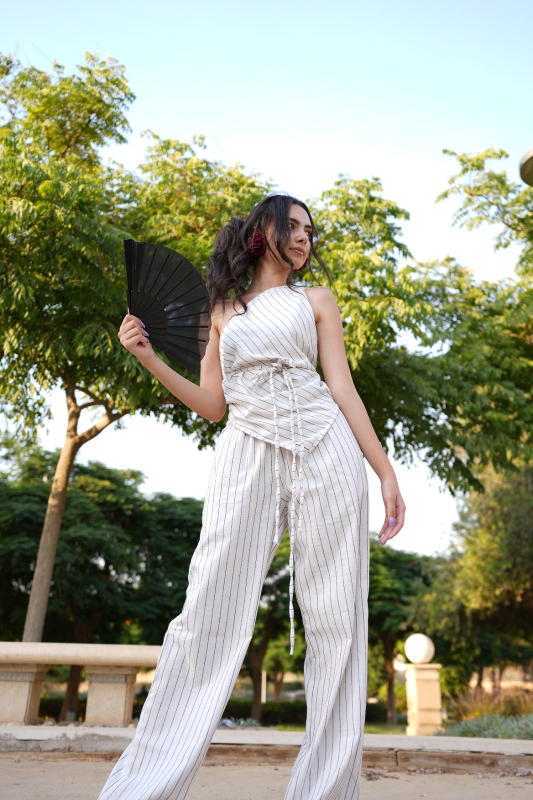A striped set in soft linen blend. Features an asymmetrical top and wide-leg pants for an easy, breezy look.